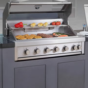Features: Six-burner grill, illuminated beverage fridge, deep drawers, commercial faucet